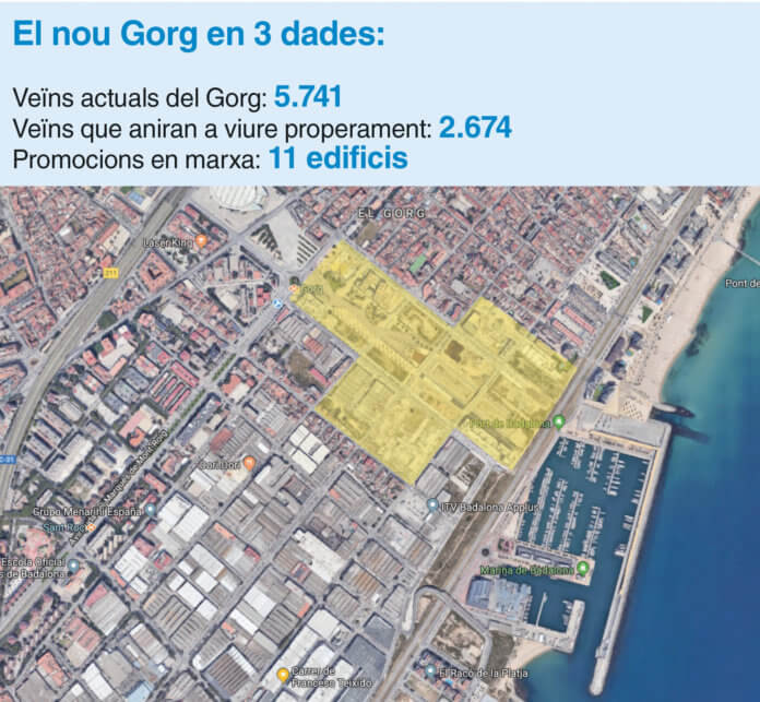Han passat gairebé més de 20 anys des dels primers enderrocs al barri del Gorg. Aquell barri de casetes baixes, amb la Comissaria de la Policia Nacional en mig del barri, va estar anys amb solars i cases ocupades. El pla per transformar el Gorg porta molts anys de retard, en part per la irrupció de la crisi, però també pels canvis de planejaments i de promotors. Ara, cada cop queden menys solars buits i les grues, ara mateix un total d’onze, omplen aquest barri badaloní. De fet, les casetes comercials, els plafons publicitaris de constructores i la maquinària pesada es distribueixen des de l’avinguda Marquès de Mont-Roig fins a les vies del tren, i entre els carrers de Ponent i Antoni Bori. Segons dades municipals, que ha tingut accés el TOT, ara mateix s’estan acabant 764 habitatges en les onze promocions immobiliàries que s’estan fent. Alguns edificis fa pocs mesos que s’han acabat i ja hi viuen els primers veïns. En una promoció del carrer Pi i Maragall, a tocar del Port, ja hi ha el primer bar obert, amb terrassa inclosa. Alguns dels nous veïns d’aquesta zona expliquen al TOT que fa molts anys esperaven que la seva promoció estigués acabada, de fet molts varen comprar el pis sobre plànol i la crisi va fer aturar aquests habitatges. Els veïns comproven que cada vegada més hi ha més promocions acabades i ara esperen que l’aigua ompli el canal, un cop també estigui acabat l’hotel del port, a l’altra banda de la via.