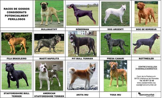 Les races de gossos potencialment perilloses determinades per la normativa vigent són: akita inu, american bully, bullmastiff, doberman, dog argentí, dog de Burdeus, fila brasiler, matí napolità, pit bull terrier, presa canari, rottweiler, staffordshire bull terrier, tosa inu (tosa japonès) i tots els encreuaments d’aquestes races.