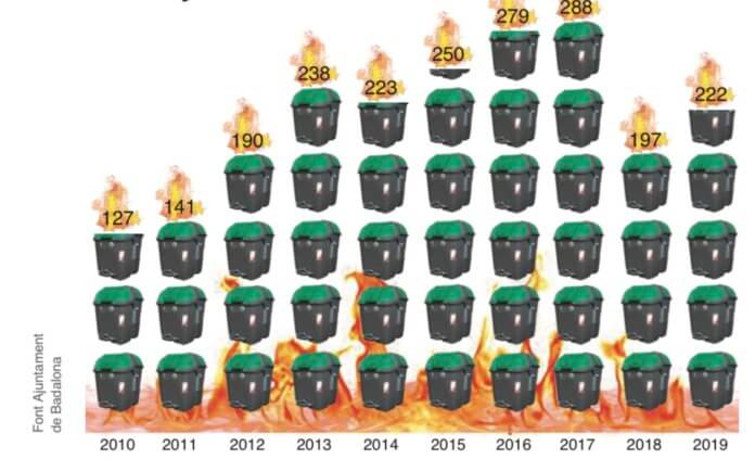 En els darrers 10 anys la xifra de contenidors que s’han cremat als carrers de Badalona ha augmentat en gairebé 100 unitats. Si l’any 2010, els piròmans cremaven 127 contenidors, 10 anys després la xifra arriba als 222 contenidors. Aquestes són dades facilitades per l’Ajuntament de Badalona i que demostren que l’any passat no va ser el més negatiu pel que fa als contenidors cremats a la via pública. En xifres, els anys 2016 i 2017 van ser els que acumulen més contenidors cremats, 288 el 2017 i 279 el 2016, sempre segons dades oficials. Substituir cada contenidor té un cost d’uns 1.000 euros aproximadament. En aquesta quantitat s’hi contempla la retirada del contenidor incendiat, netejar la part afectada i dur-lo a la planta de tractament.