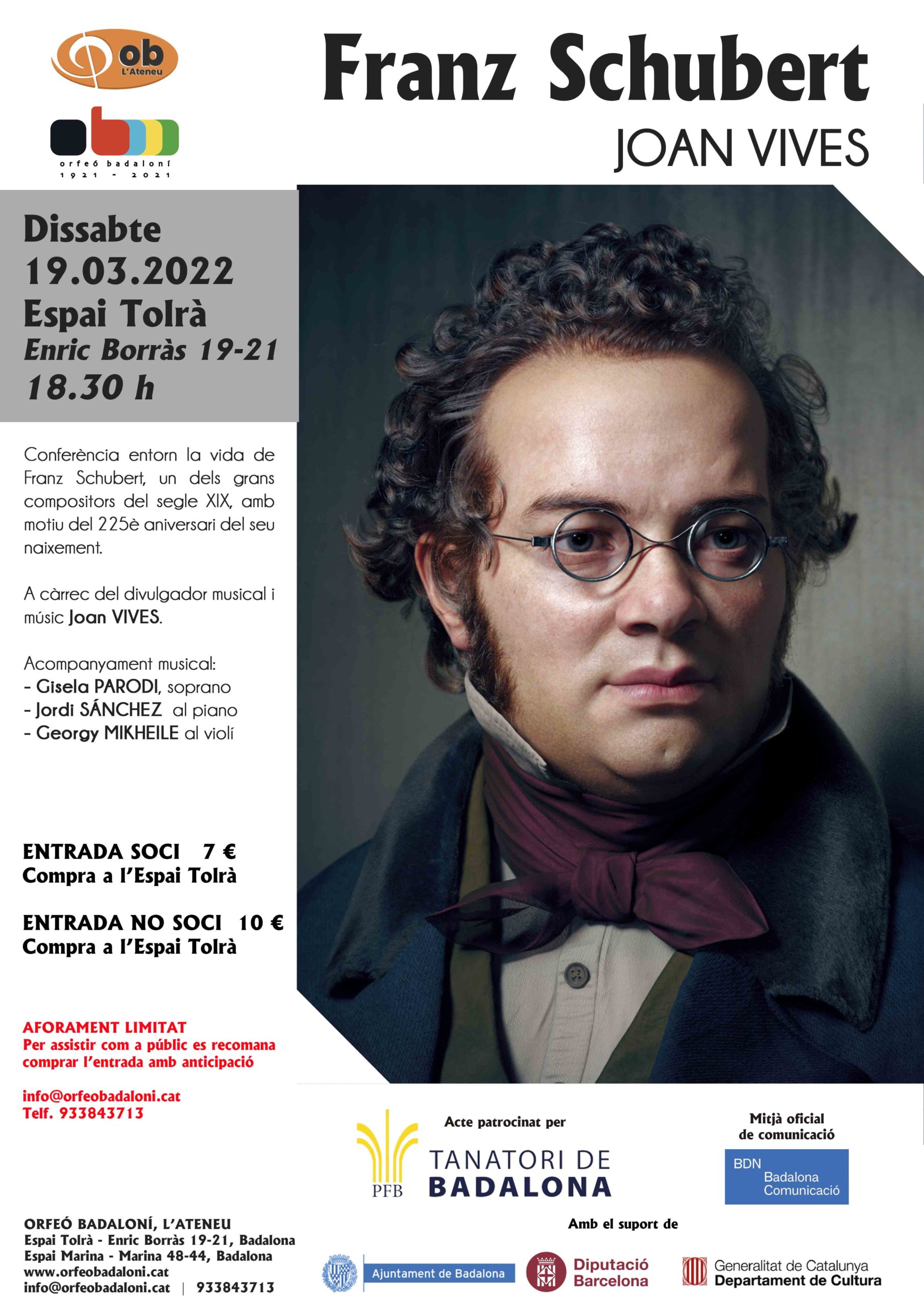 La conferència anirà a càrrec del reconegut divulgador musical i músic Joan Vives, que abordarà detalls de la vida i l’obra de Schubert, un dels principals compositors del segle XIX, en un acte que comptarà amb l’acompanyament musical de la soprano Gisela Parodi, el pianista Jordi Sánchez, i el violinista Georgy Mikheile, que interpretaran algunes de les peces més conegudes del músic austríac.