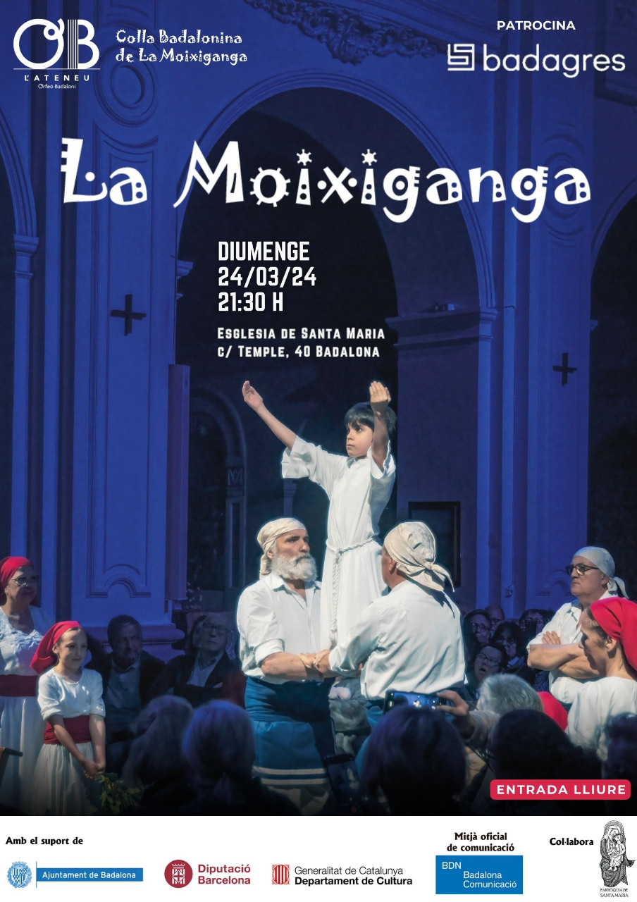El diumenge 24 de març, Diumenge de Rams, la Colla badalonina de la Moixiganga celebrarà la que serà la representació de La Moixiganga a Badalona, obrint així al seguit d’actes programats per Setmana Santa d’aquest 2024. La primera representació de La Moixiganga a l’església de Santa Maria de Badalona va ser l’any 1991 responent a una iniciativa d’en Ferran Cebrián, en Joan Soler i mossèn Jaume Aymar. Es tractava de portar a l’església un espectacle que ja s’havia representat a l’escenari del Círcol, incorporant textos de caràcter religiós entre quadre i quadre. Ràpidament l’espectacle va anar prenent volada i amb el temps s’hi van anar afegint nous elements escènics, així com la participació de diverses entitats culturals de la ciutat. En aquesta ocasió, i com ja ve succeint els darrers anys, els quinze quadres escènics dels que consta actualment la representació aniran acompanyats de l’actuació dels Estaferms de la Confraria de Sant Anastasi, les saetas de El Rincón del Arte, els cants de la Capella de Música de Badalona, l’actuació dels Bastoners de Canyet, i la música en viu de La Bossa Verda que, mesclant-se entre passatge i passatge, aporten a l’acte un atractiu escenogràfic i una solemnitat molt alts. L’acte estarà conduït i narrat per components del grup El Nucli Teatre. La representació començarà a les 21:30h, a Santa Maria.