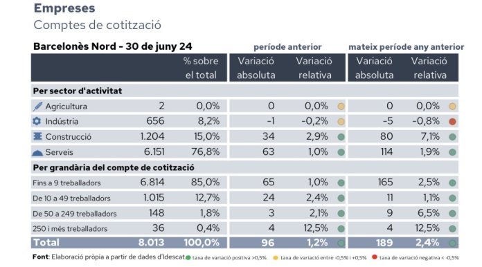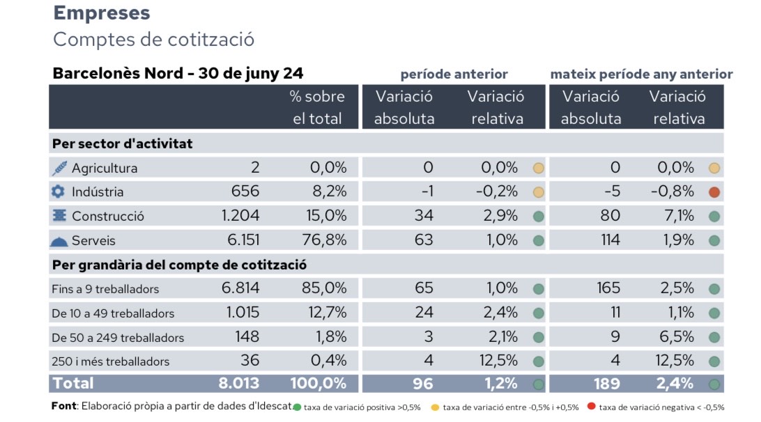 (quatre empreses més). Són dades de la Cambra de Comerç, segon trimestre de 2024 del teixit empresarial i del mercat laboral del Barcelonès Nord, elaborat pel Gabinet d’Estudis Econòmics.