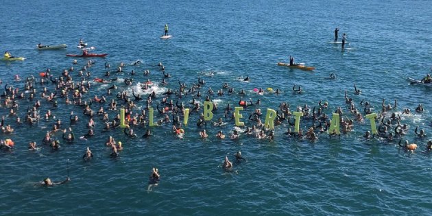 Més de 600 persones han nedat, aquest diumenge al matí, els 800 metres que separen el Club Natació Badalona del pont del Petroli. Els nedadors han fet aquest recorregut agafats de la mà de les lletres de Llibertat per exigir l’alliberament dels polítics presos.