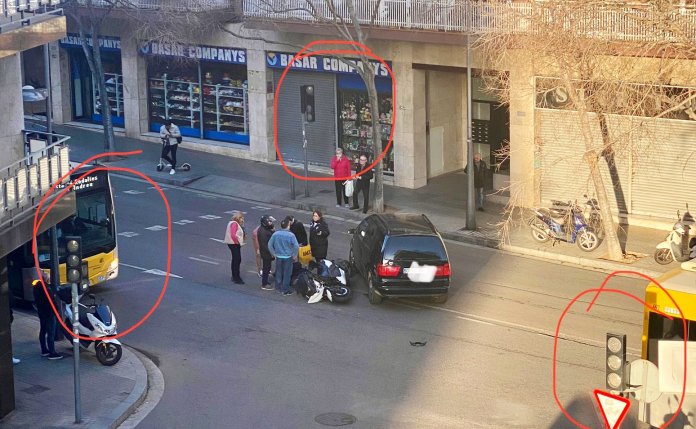 Després de l’accident entre una moto i un cotxe que ha tingut lloc prop de les cinc de la tarda, agents de la Guàrdia Urbana han acudit per fer un control del trànsit.