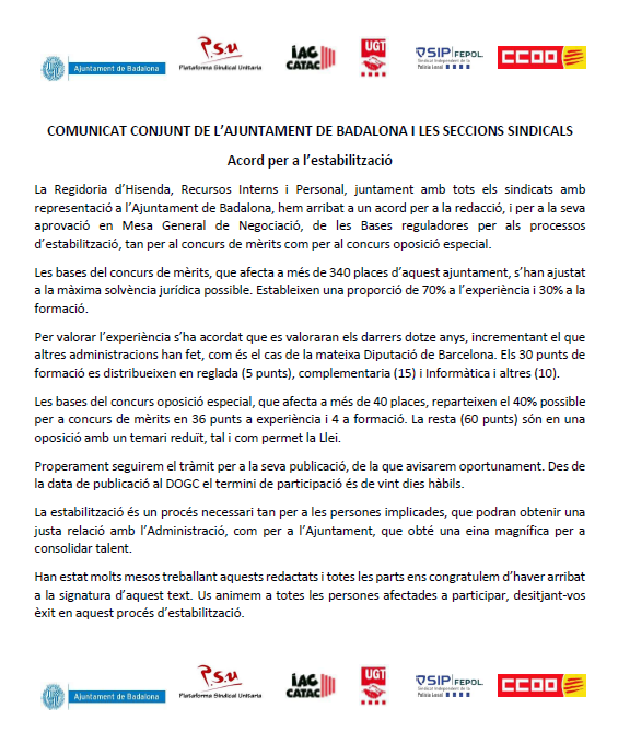 La Regidoria d’Hisenda, Recursos Interns i Personal, juntament amb tots els sindicats amb representació a l’Ajuntament de Badalona signen un acord per a la redacció i aprovació de les Bases reguladores per als processos d’estabilització. Les bases del concurs de mèrits afecten a més de 340 places i estableixen una proporció de 70% a l’experiència i 30% a la formació. Les bases del concurs oposició especial afecta 40 places.