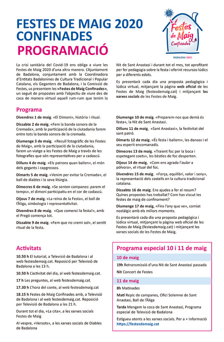 Des d’aquest divendres, 1 de maig, ja s’ha activat el web de les Festes de Maig 2020 confinades. Al web trobareu totes les propostes virtuals i per fer a casa durant aquests dies, fins el 17 de maig.