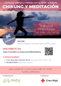 La Creu Roja i Mindful BDN han organitzat una activitat solidària a l’aire lliure que es farà el dissabte dia 2 de juliol, a les 9:45 hores, al Parc de Can Solei i Ca l’Arnús. L’activitat es tracta d’una jornada de Chikung i meditació, amb capacitat per a 50 persones. La finalitat d’aquesta jornada serà la de donar suport als projectes d’atenció a les persones amb dificultats socials i econòmiques i poder ajudar a diferents col·lectius com els refugiats, població migrada, dones en situació vulnerable, etc.