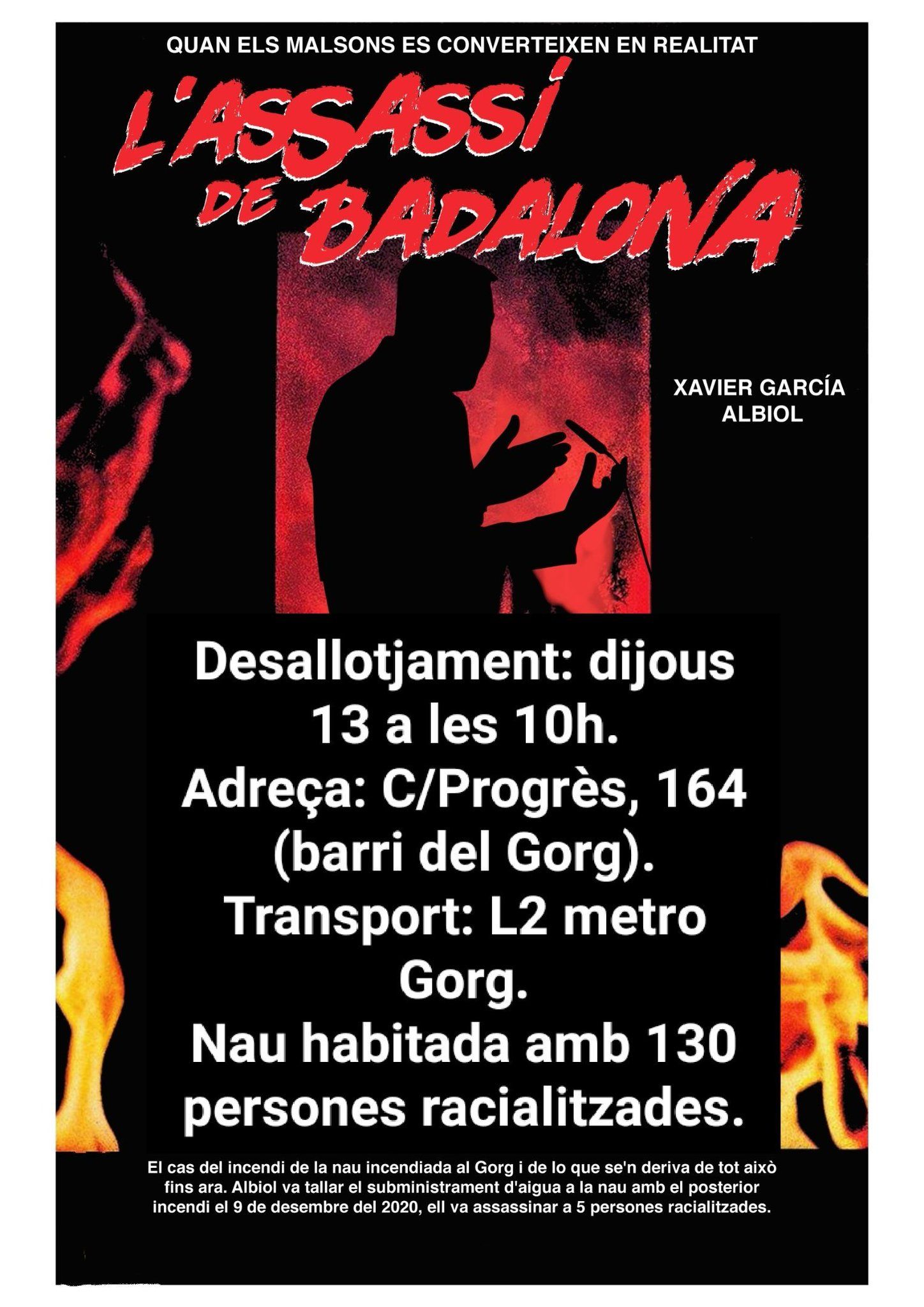 Xavier García Albiol ha comunicat aquest dimecres que ha denunciat, davant dels Mossos, els autors d’un cartell que el qualifica d'”assassí de Badalona”. Concretament, el pamflet és la convocatòria per a una concentració davant de la nau del carrer Progrés que serà desallotjat aquest dijous. Albiol considera que «no permetré que em diguin assassí aquells que estan convocant una manifestació per a evitar el desallotjament de la nau ocupada del carrer del Progrés; tot i aquests intents d’intimidació, seguiré defensant els veïns de Badalona davant les ocupacions il·legals que els generen greus problemes d’inseguretat i convivència“. El cartell ha estat compartit a Twitter per diversos usuaris.