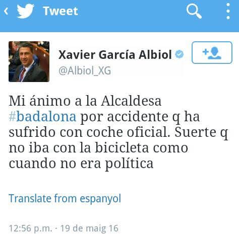 El líder del PPC i regidor a l’Ajuntament de Badalona, Xavier Garcia Albiol, ha fet mofa aquest dijous de l’accident de trànsit que va patir dimecres l’alcaldessa de la ciutat, Dolors Sabater. En un missatge a les xarxes socials li dóna suport, però afegeix amb to irònic: “Sort que no anava en bicicleta com quan no era política”, tot recordant que l’accident el va patir amb el “cotxe oficial”. Sabater lamenta el comentari d’Albiol en una altra piulada en la que recorda la multiplicitat de càrrecs del dirigent popular. “Trist que un senador, diputat i regidor faci mofa d’un accident. El treballador ferit evoluciona be”. L’accident va tenir lloc dimecres, però va ser de caràcter lleu, quan un altre cotxe va envestir per darrer el cotxe oficial. Tot i l’accident, l’alcaldessa va poder participar de matinada en el recompte de persones sense sostre a la ciutat.