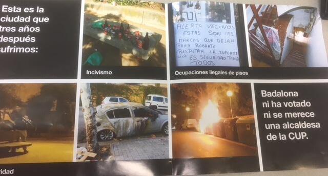 Com l’any 2010, el díptic del PP de Badalona torna a utilitzar el fons negre i imatges de conflictes per il·lustrar el que, segons Albiol, ha dut la política de l’actual govern municipal: incivisme, inseguretat i ocupació il·legal de pisos. “Badalona ni ha votat ni es mereix una alcaldessa de la CUP”, explica el fulletó. També es veuen imatges de contenidors cremats, botellons i un home amb una arma a la mà en un parc de la ciutat.