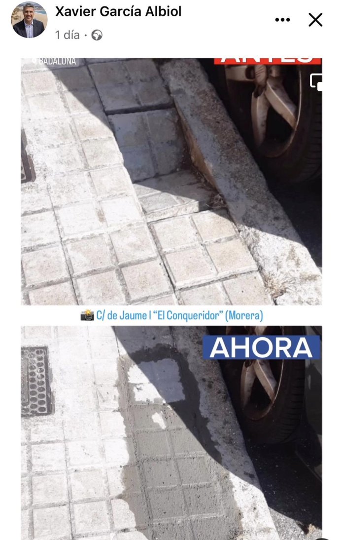L’alcalde de Badalona, Xavier Garcia Albiol, ha publicat a les seves xarxes socials una petita obra de microurbanisme, arreglar dues rajoles d’una vorera del carrer Jaume I el Conqueridor, al barri de la Morera. Les rajoles, dues, estaven en mal estat i l’alcalde ha anunciat que han estat reparades. Un fet que en qualsevol gran ciutat catalana no seria ni notícia, però que a Badalona sí. Durant els darrers dies, Albiol ha intensificat l’anunci d’aquesta mena, com la instal·lació d’un sol banc o una sola paperera.