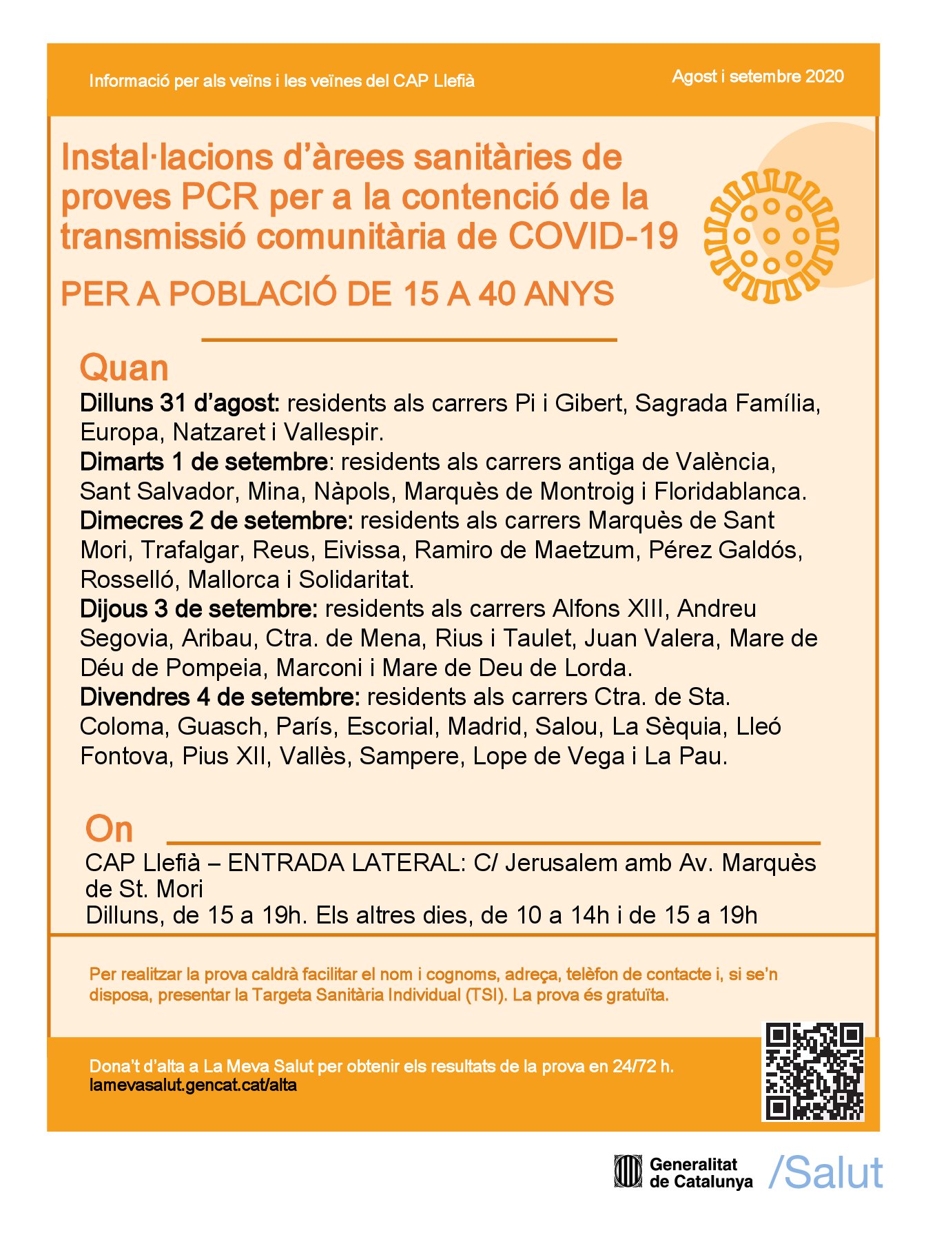 Les proves es duran a terme en horari de 15 a 19h el dilluns 31, i de 10 a 14h i de 15 a 19h la resta de la setmana. Per evitar aglomeracions als centres, les PCR es prioritzaran per carrers, de manera que, en funció del carrer on es visqui, caldrà anar un dia o un altre a fer-se la prova. Properament s’informarà de la planificació dels carrers. És important que la població se cenyeixi al dia assignat, per assegurar que no hi haurà concentracions de gent fent cua als centres.