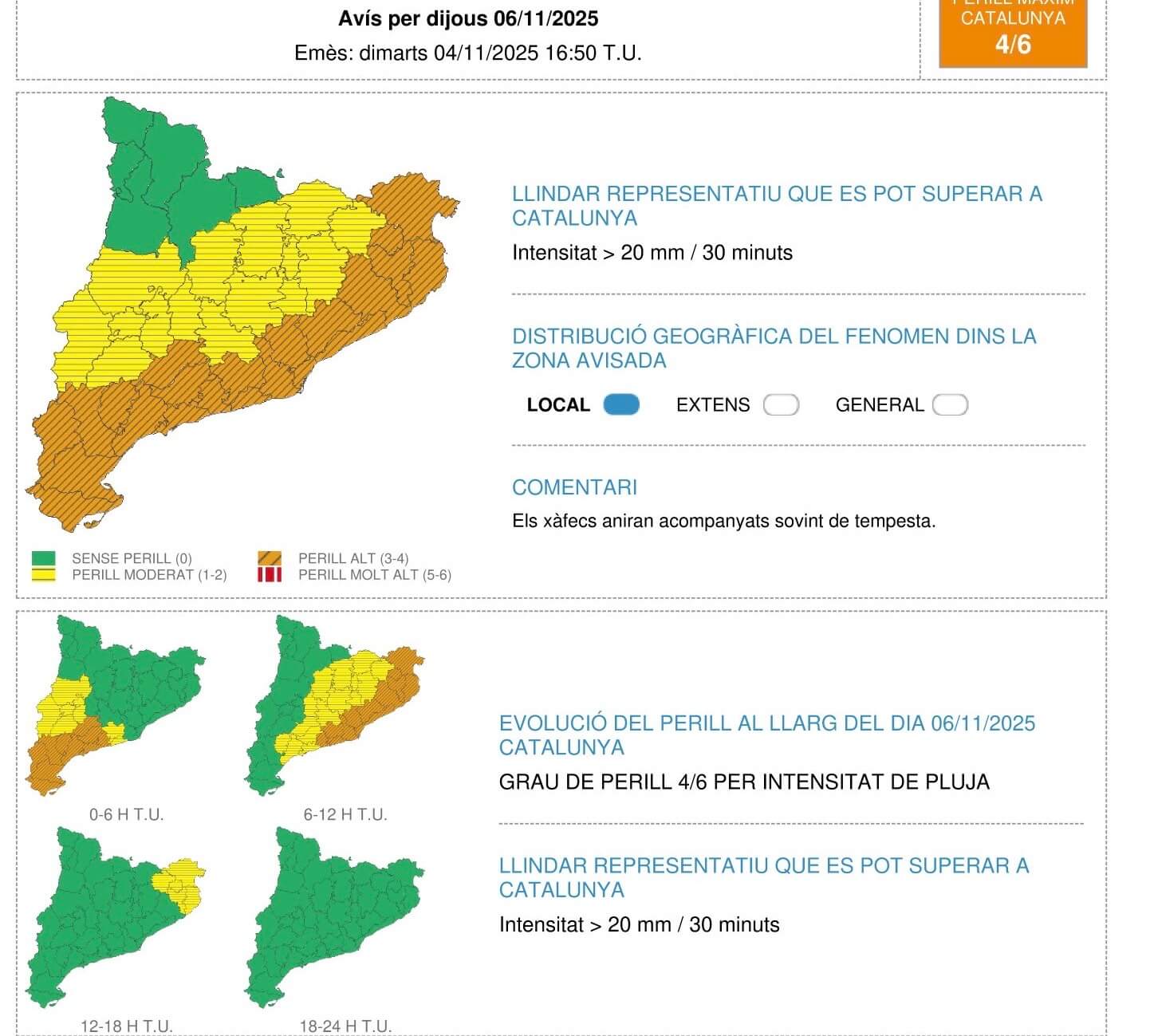 Les darreres sortides dels models meteorològics continuen confirmant un canvi sobtat de temps de cara a dijous. El pas d’un front actiu, sumat a la formació d’una petita borrasca davant del litoral català, afavoriran que la pluja sigui protagonista i que pugui descarregar amb intensitat en algunes comarques. El Servei Meteorològic de Catalunya ha emès avisos d’intensitat de precipitació i Protecció Civil ha activat en fase d’alerta el pla Inuncat per la previsió de pluja forta. La precipitació tindrà una durada limitada, no plourà tot el dia, per bé que en menor o major mesura acabarà afectant tot el territori català.