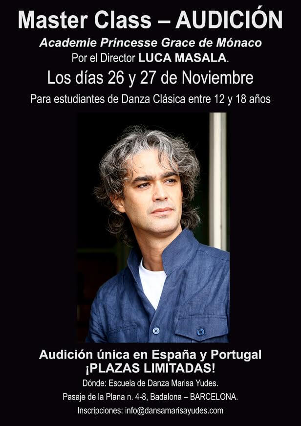 Aquest proper cap de setmana, dissabte 26 i diumenge 27 de novembre, l’Escola de Dansa Marisa Yudes de Badalona, serà la seu de les Audicions per a l ‘ingrés a la prestigiosa Institució d Alt Rendiment Europea, l’Academie de Danse Princesse Grace de Mónaco. El seu director, Lucas Masala, tota una autoritat de la Dansa actual, serà qui jutjarà als 56 participants que volen entrar en aquest prestigiós Centre Internacional. Una vegada més Badalona serà el punt de trobada de la Dansa internacional, ja que 53 ballarins i ballarines d’entre 12 i 18 anys, s´instal·laran durant el cap de setmana a la ciutat, repartits entre hotels, hostals i algun apartament , la majoria acompanyats per les seves famílies. L’audició d’aquest cap de setmana va dirigida a aspirants d’Espanya, França i Portugal.
