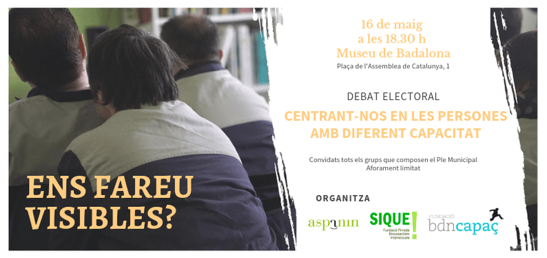 Les fundacions Aspanin, Sique i Badalona Capaç, entitats que treballen en l’àmbit de les persones amb diferent capacitat intel·lectual a Badalona, organitzen aquest dijous 16 de maig a les 18:30h un debat electoral al Museu de Badalona on estan convidats tots els partits polítics amb representació al ple.