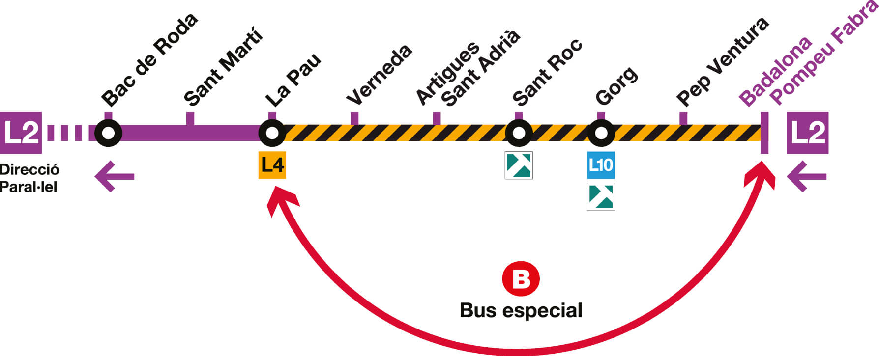 A partir de dilluns i fins al diumenge 28 d’agost (tots dos inclosos), estarà tancat el tram de la línia 2 de metro entre les estacions de La Pau i Badalona Pompeu Fabra. La suspensió del servei en aquest tram de 4,5 quilòmetres de longitud permetrà portar a terme treballs de modernització de la infraestructura i millora de les vies. La resta de la línia 2, entre Paral·lel i La Pau, funcionarà amb normalitat.
