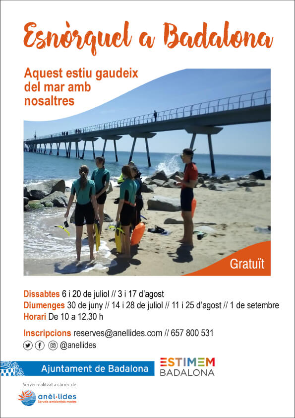Aquest estiu l’Ajuntament de Badalona ofereix per primera vegada 10 sortides guiades d’esnòrquel per tal de donar a conèixer la riquesa natural de les platges de la ciutat. Les sortides, amb inscripció prèvia, es faran en cap de setmana del 30 de juny a l’1 de setembre alternant diumenges i dissabtes. L’esnòrquel és la pràctica de busseig arran d’aigua, o una immersió lleugera. La platja de Badalona, normalment, és vista com a un espai de lleure on prendre el sol i banyar-se però, sobretot, és un espai natural que, més enllà de la sorra, amaga una biodiversitat molt poc coneguda i, alhora, sorprenent. És per això que des de l’Ajuntament de Badalona i, amb la col·laboració d’Anèl·lides, Serveis Ambientals Marins, s’oferiran sortides d’esnòrquel guiades per experts per tal d’apropar-se i conèixer de primera mà els organismes marins que viuen al litoral badaloní. A cada sortida s’hi podran inscriure 12 persones com a màxim i, amb una edat mínima de 8 anys (nens i nenes amb bona capacitat natatòria). Des de l’organització s’oferirà als participants el material necessari: ulleres, tub, peus d’ànec, neoprens i boies de seguretat així com càmera fotogràfica submarina (per parella). El punt de trobada de les sortides és l’Escola del Mar (passeig de la Rambla, 37), a les 10 hores on, de manera prèvia, es farà una explicació de com utilitzar el material i, també, es farà una introducció a la fauna marina del Mediterrani i com observar-la. En acabar l’activitat aquàtica es tornarà a l’Escola del Mar per comentar els organismes marins que s’han observat i conèixer-los millor. En conjunt, l’activitat, tindrà una durada aproximada de dues hores i mitja. Les sortides són gratuïtes i es faran en cap de setmana alternant dissabte i diumenge i, també, des de les diverses platges de la ciutat, amb el calendari següent: