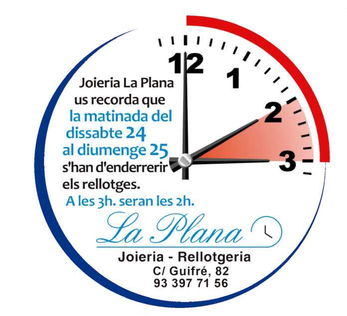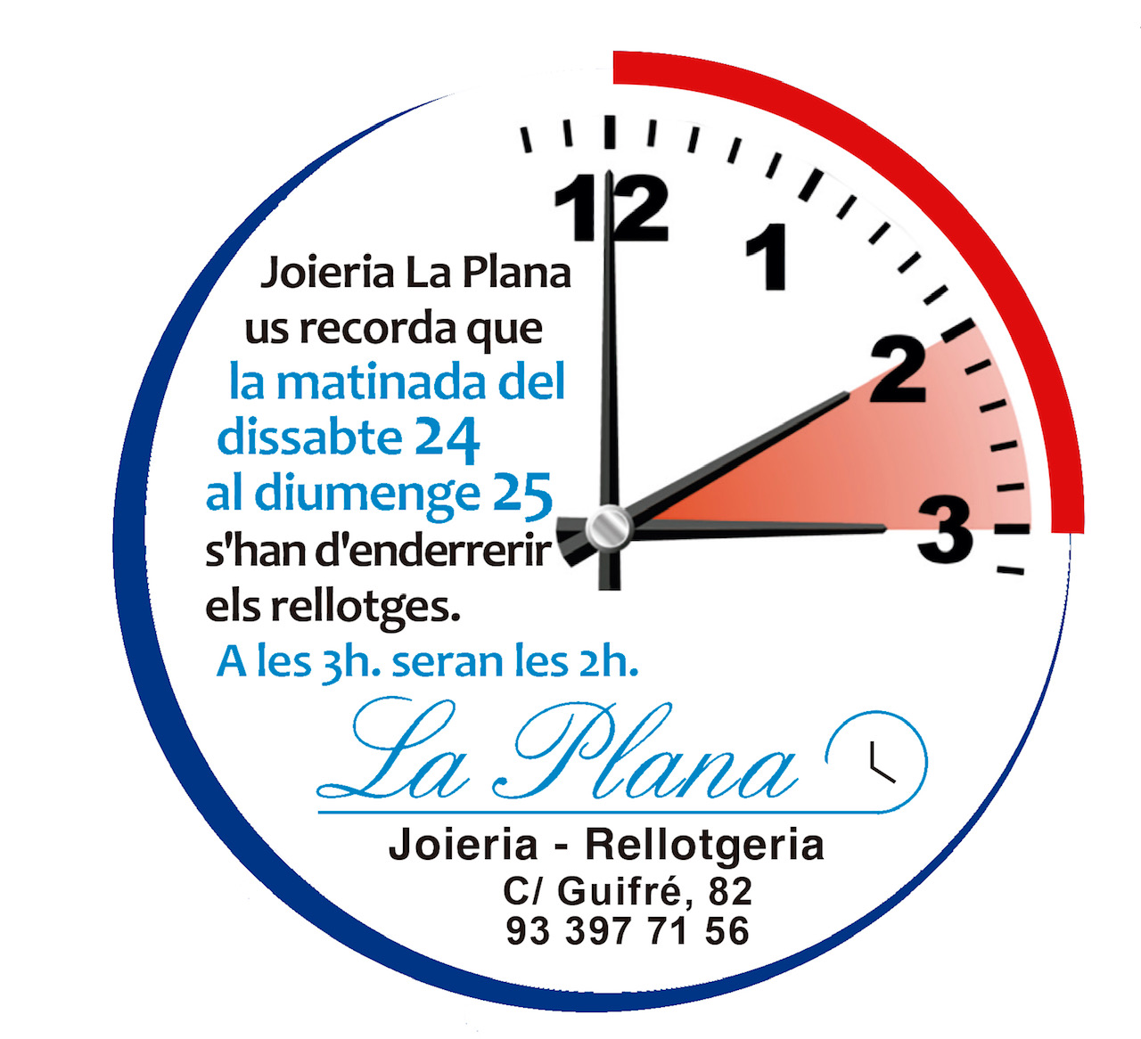 La matinada d’aquest diumenge 25 d’octubre acaba l’horari d’estiu i comença l’horari d’hivern. A les 3.00 hores de la matinada caldrà endarrerir els rellotges una hora fins a les 2.00 hores, per la qual cosa aquesta nit guanyarem una hora.