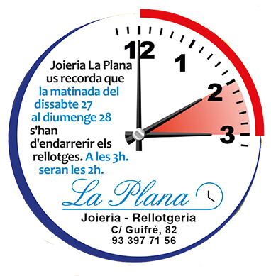 La matinada d’aquest dissabte 28 a diumenge 29 d’octubre toca canviar l’hora. Aquesta matinada de diumenge acaba l’horari d’estiu i comença el d’hivern i cal canviar el rellotge. A les 3.00 hores seran les 2.00 hores novament i, per tant, la nit de dissabte a diumenge es podrà dormir una hora més.