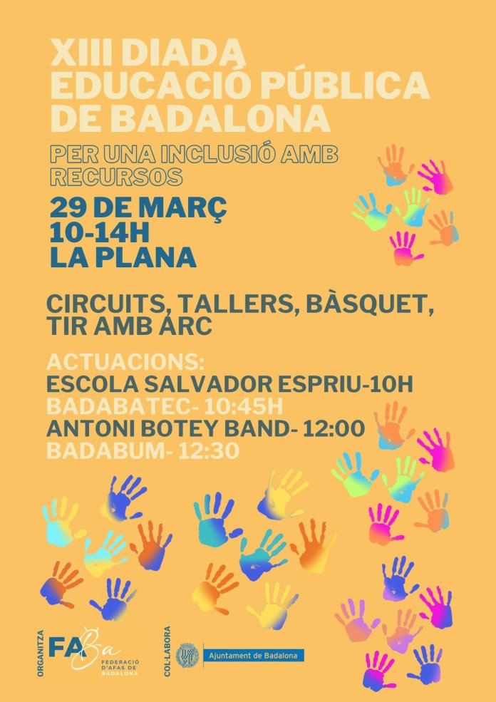 Els punts claus son: més recursos humans i econòmics per què la inclusió sigui efectiva vetlladors suficients per atendre totes les necessitats de la canalla que ho necessiti que tots els centres i totes les actives que es realitzin siguin inclusives i no excloguin a l’alumnat NESE. Les escoles d’educació especial que son municipals reivindiquen: més inversió en infraestructures per aconseguir unes instal·lacions dignes i adequades agilitzar el procés cobertura de baixes dels professionals finançament i organització del casal municipal per a canalla amb necessitats especials mitjançant licitació i no subvenció finalista fer de Badalona una ciutat cuidadora. Durant tot el matí hi haurà circuits, tallers, basquet, tir amb arc… De 10 a 11h les actuacions de l’alumnat de l’escola Salvador Espriu i INS Pau Casals amb la coral, Badabatec, els gegants de la Jungfrau i en Barrigota de Can Barriga a partir de les 12h Antoni Botey Band i Badabum Band. Sobre les 11h des de les AFE’s dels centres d’educació especial faran concentració per reivindicar les seves necessitats, a les quals ens sumem la resta d’AFE’s per fer visibles les mancances per fer una inclusió a l’aula amb qualitat.
