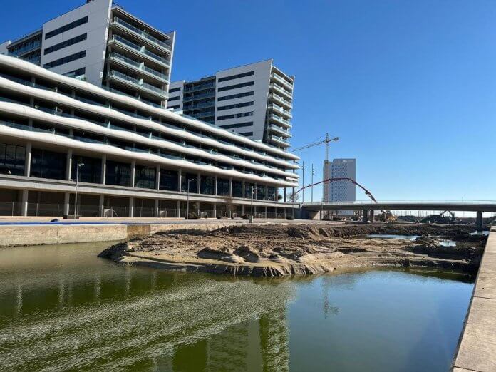 En aquesta àrea es retiren i es draguen més de 26.000 m3 de sorra. Les terres actuals (que són reblerts d’antics abocaments no aptes per a l’ús urbà al qual està destinat aquest espai) s’han garbellat i separat abans de transportar-les a un abocador. Part d’aquestes terres extretes per a la construcció del canal es traslladen fins a reposar la cota del terreny actual en la zona destinada al desviament del ferrocarril i que és imprescindible per no interrompre el servei mentre es construeix el viaducte definitiu.