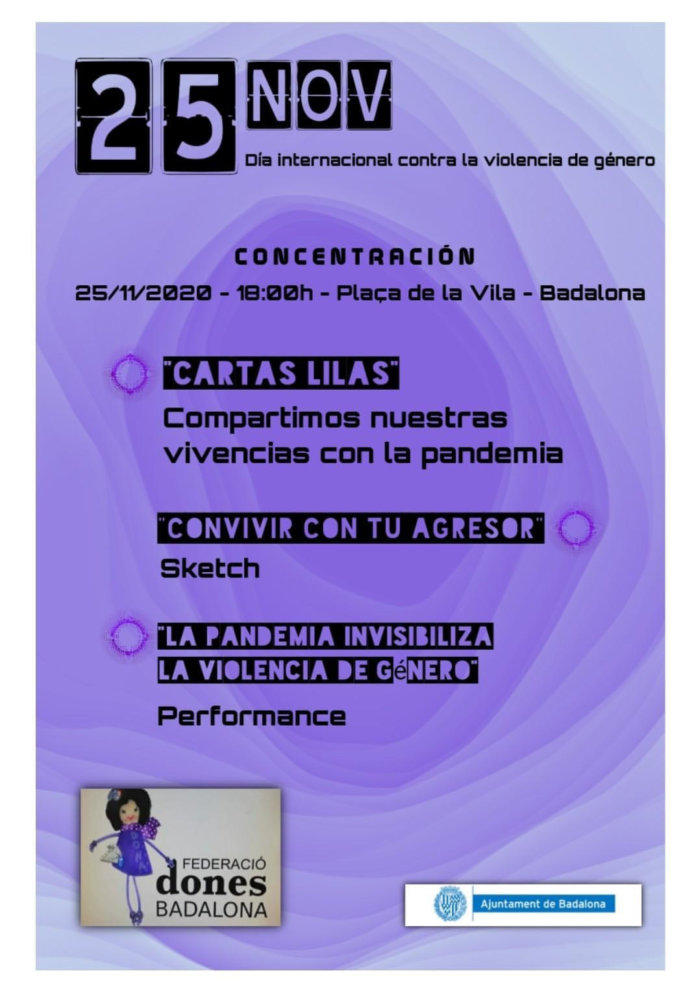 Badalona ha programat un seguit d’actes en commemoració del Dia Internacional per a l’eliminació de la violència vers les dones que se celebra el dimecres dia 25 de novembre. La Federació de Dones de Badalona, i l’Ajuntament de la ciutat, han preparat una concentració, amb les corresponents mesures de seguretat, a la plaça de la Vila. A partir de les 18h, tindrà lloc diversos actes, com una performance, un sketch i la lectura d’unes cartes liles on les participants compartiran vivències amb la pandèmia.