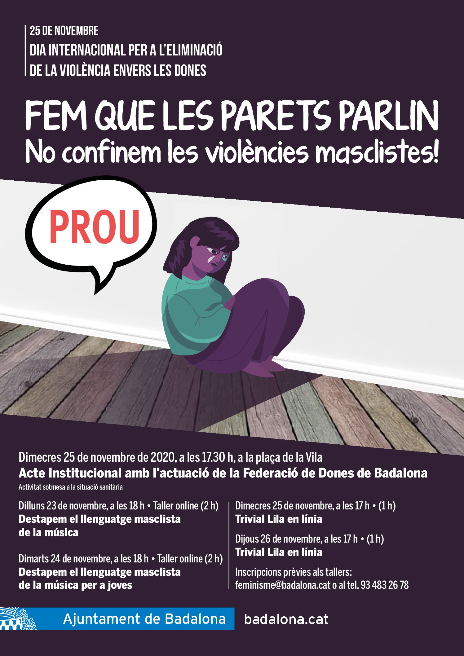 En el marc del Dia Internacional per a l’eliminació de la violència envers les dones, l’Ajuntament de Badalona ha programat durant la pròxima setmana diversos tallers i activitats telemàtiques per conscienciar la ciutadania sobre les violències masclistes. El calendari és el següent:
