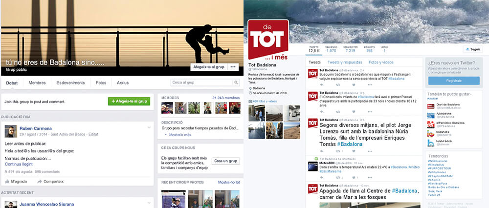 El grup relacionat amb Badalona amb més seguidors a Facebook és “Tú no eres de Badalona si no…” amb més de 21.000 seguidors. També destaca el grup Badalona Recuerdos amb més de 17.000 seguidors.