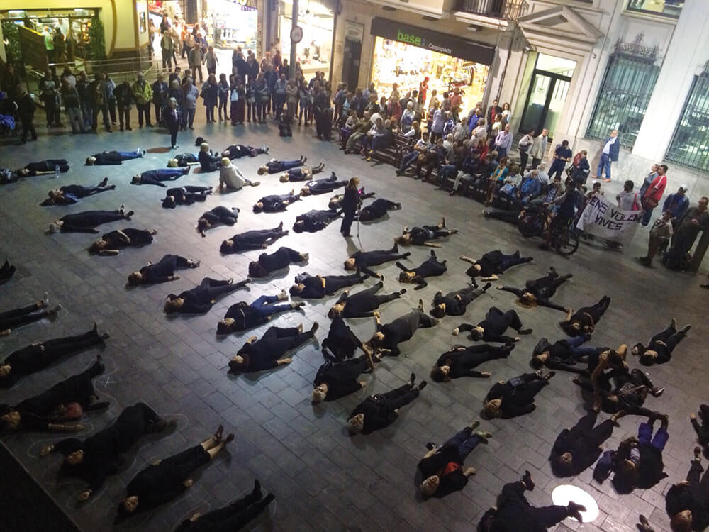 Al voltant de 80 dones van participar divendres en la performance Women In Black Action a la plaça de la Vila de Badalona. Les participants, vestides de negre, es van estirar a terra, mentre es llegien els noms de totes les dones assassinades per la violència masclista en el que portem d’any, un total de 71. Les seves figures es van resseguir amb un guix, i un cop acabat es va fer un minut de silenci.