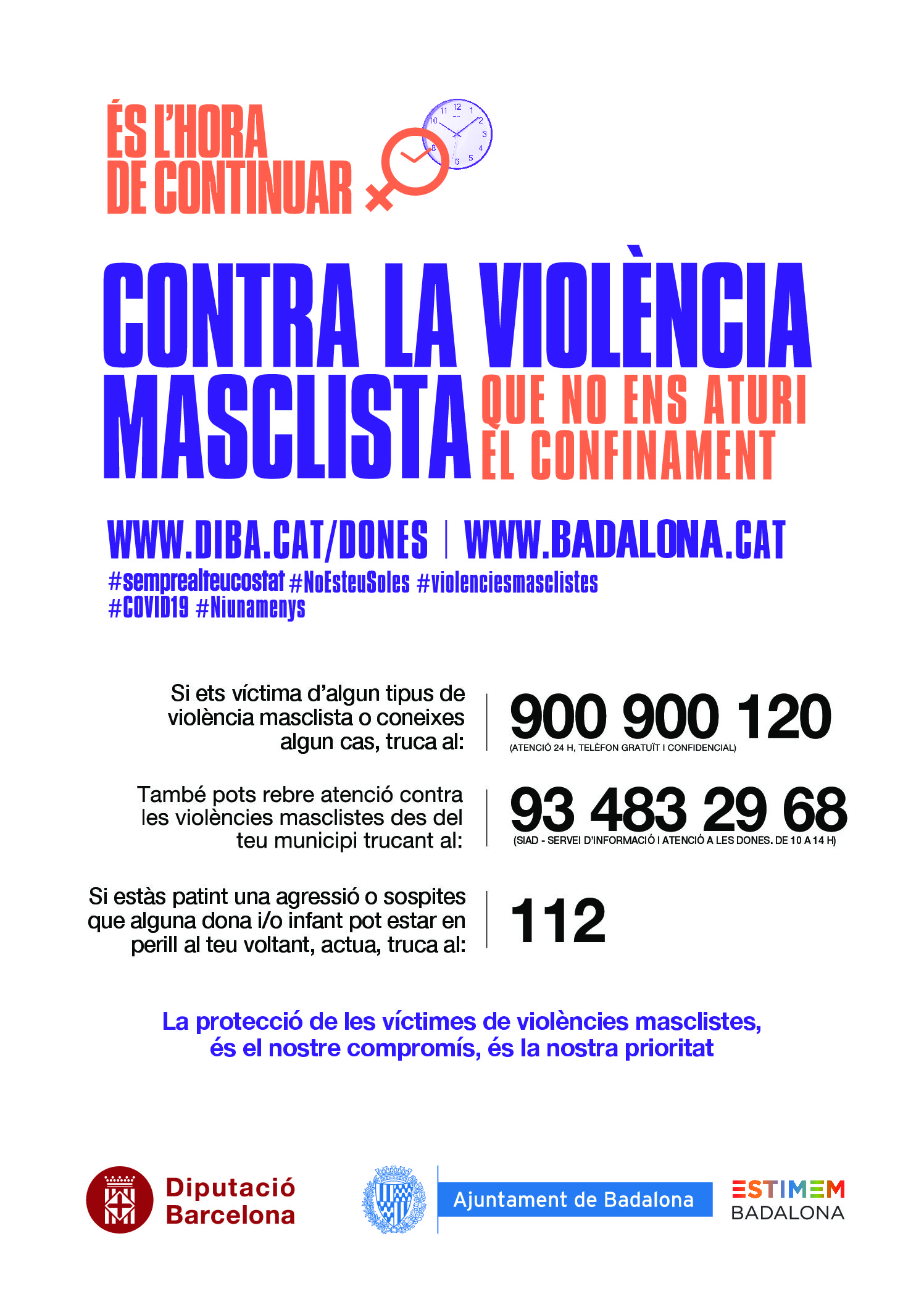 L’Ajuntament de Badalona ha impulsat la campanya “Contra la violència masclista, que no ens aturi el confinament”, organitzada amb el suport de la Diputació de Barcelona per interpel·lar la ciutadania i encoratjar-la a denunciar qualsevol cas de violència masclista que conegui. La iniciativa inclou materials gràfics on apareixen els telèfons d’atenció contra la violència masclista que s’han dissenyat amb la idea de difondre’ls per les xarxes socials i per ser distribuïts en els comerços de primera necessitat (farmàcies, botigues d’alimentació, forns de pa, supermercats, etc.). La difusió dels missatges en aquests establiments és imprescindible, ja que són llocs on les possibles víctimes de violència poden anar soles i demanar ajuda.