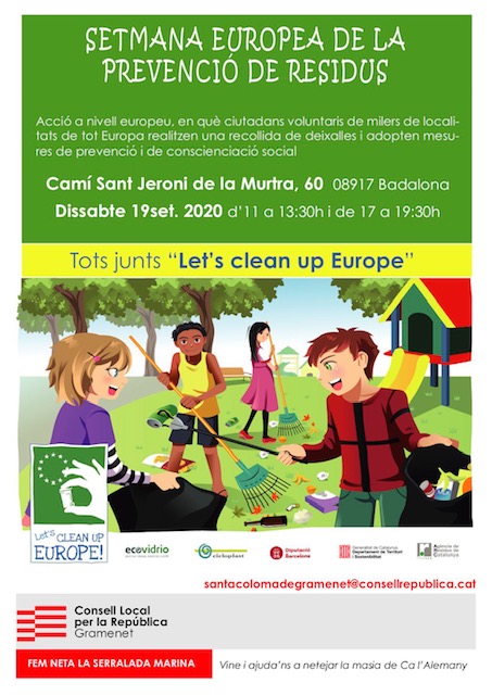 Badalona se suma, aquest dissabte 19 de setembre, a l’acció comuna a tot Europa per conscienciar sobre la quantitat de residus que llencem de forma incontrolada a la natura i promoure accions de sensibilització a través de la recollida d’aquests residus abocats il·legalment als boscos, platges, marges de rius, etc. A Badalona s’ha organitzat, durant tot el dia, una campanya per netejar els voltants de la Masia de Ca l’Alemany. La trobada serà davant del Camí de Sant Jeroni, 60.