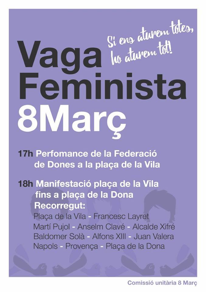 Des de la comissió unitària 8 de març convoquen a totes les dones de la ciutat a aturar-nos des de quatre àmbits: llars, consum, estudis i treballs de tot tipus, legals o de economia submergida, a l’àmbit públic o privat. Fan una crida a totes les dones, lesbianes, bisexuals i trans, gitanes, paies, migrades, racialitzades, amb diversitat funcional i/o intel·lectual, a les joves i a les més grans, a totes, a sumar-se a la vaga i a visibilitzar que si s’aturen totes, ho aturen tot!