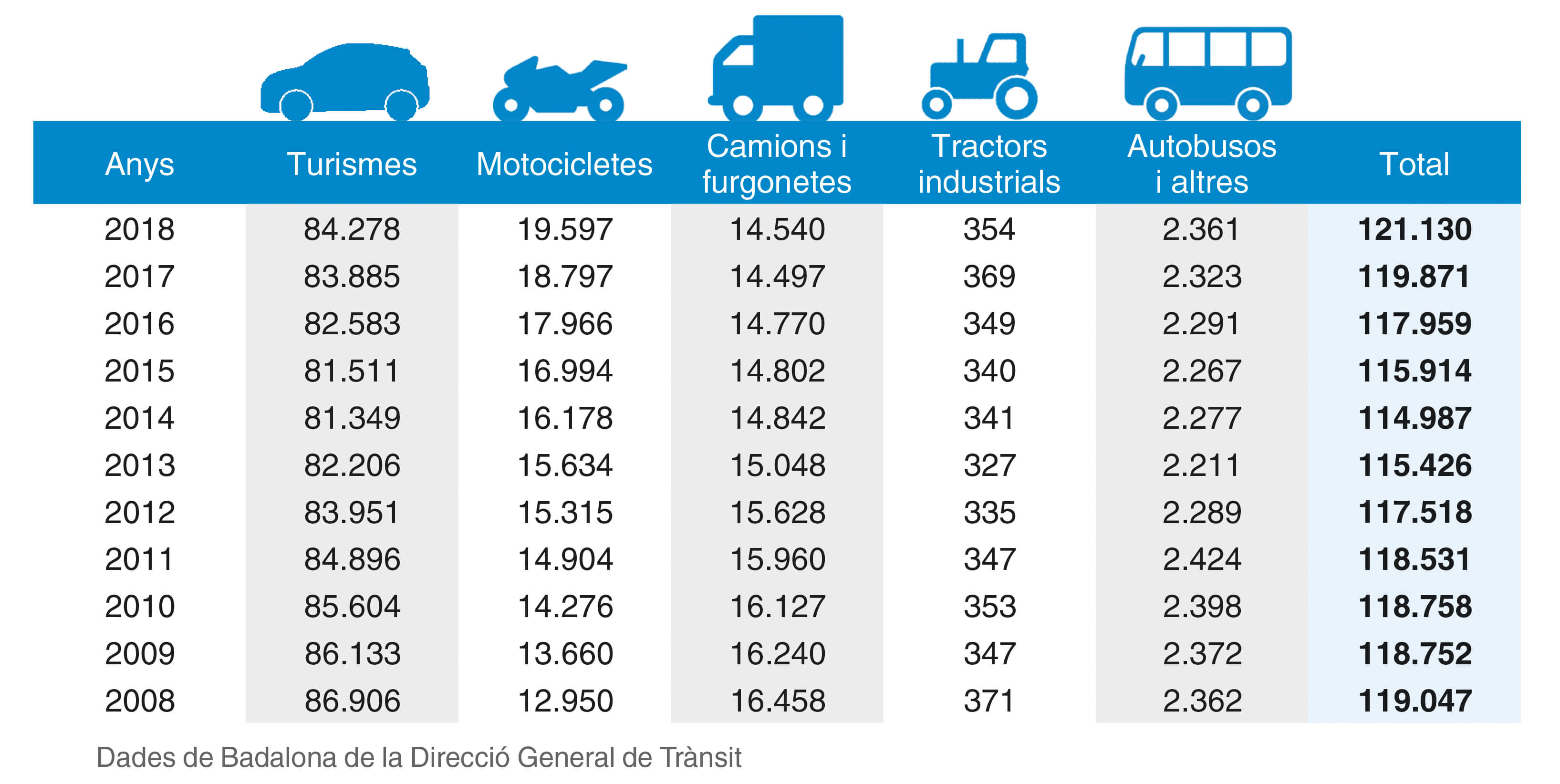 Badalona té un parc de vehicles censats que indiquen que gairebé la meitat de la població de la ciutat té un cotxe, moto, furgonetes, camions, busos o tractors industrials. Segons les dades de la Direcció General de Trànsit, i que ha tingut accés el TOT, hi ha variacions de vehicles censats a la ciutat de Badalona, durant els darrers 10 anys, tot i les crides per promoure l’ús del transport públic.