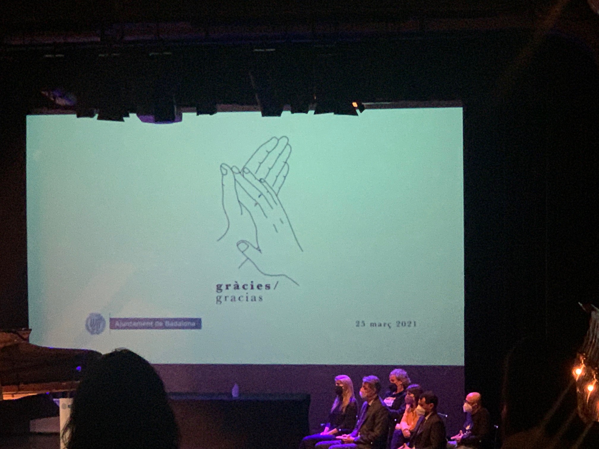 El Teatre Zorrilla va acollir aquest dijous l’acte d’homenatge que l’Ajuntament de Badalona ha tributat a tots els treballadors i les treballadores essencials que han estat en primera línia en la lluita contra la COVID-19 des de l’inici de la pandèmia. El meteoròleg i presentador Tomàs Molina va ser el conductor de l’acte que va comptar amb l’ambientació musical del duet Khachatryan–Allende del Conservatori de Música de Badalona. Per l’escenari del Teatre Zorrilla, on van estar acompanyats de l’alcalde de Badalona i d’una representació de tots els regidors i regidores de l’Ajuntament, hi van passar representants de Badalona Serveis Assistencials (BSA); de l’Hospital Germans Trias i Pujol; de l’Atenció Primària, de l’Institut Municipal de Serveis Personals de Badalona (IMSP); dels Serveis d’Emergències (SEM) i del Grup la Pau; cossos de seguretat i de protecció civil; de les residències de gent gran; dels centres educatius; de Pompes Fúnebres; Federació de Comerciants de Badalona; Federació de Mercats de Badalona; Associació de Marxants de Badalona; familiars i treballadors municipals d’aquells serveis que van ser declarats essencials. Tots ells van transmetre a través de les seves paraules i dels seus silencis, les seves vivències, els esforços, els neguits, les pors i les esperances viscudes en la seva feina diària lluitant contra els efectes de la Covid-19 i estant al costat de les persones que més ho necessitaven. Les emocions trameses des de l’escenari, i compartides pels assistents a l’acte, es van barrejar amb l’agraïment que va arribar en tot moment des de la platea.