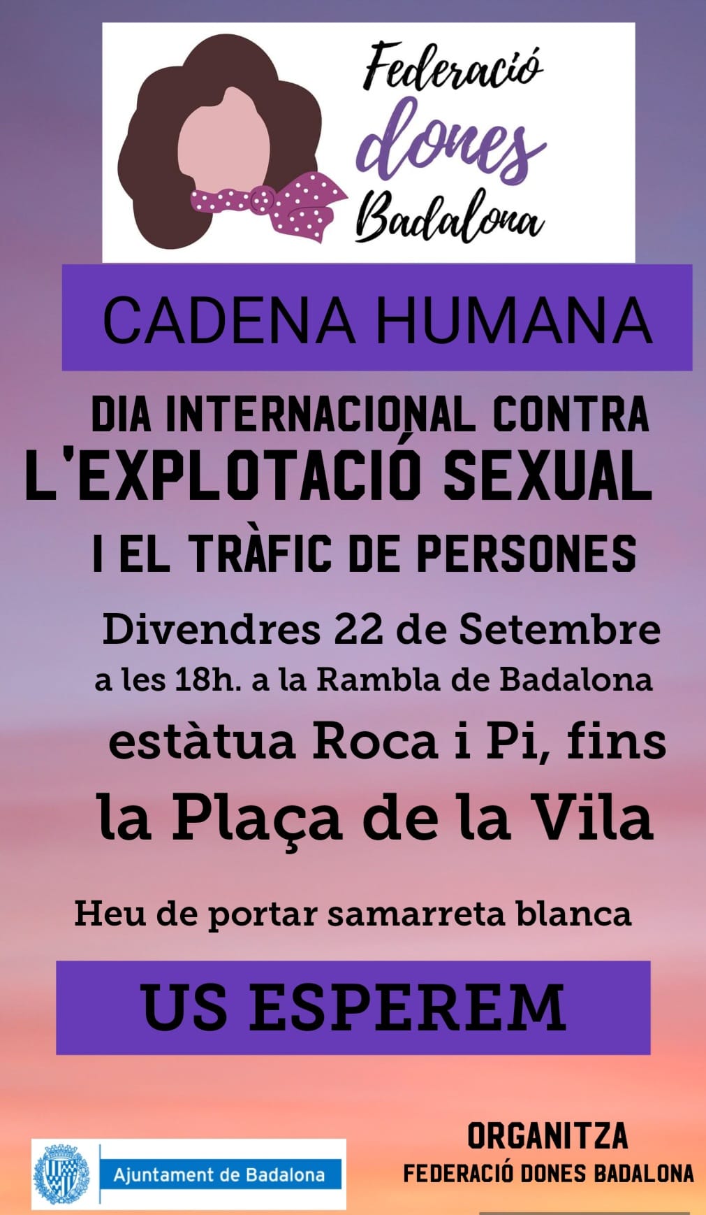 Aquest divendres, 22 de setembre, la Federació de dones Badalona ha convocat una cadena humana per commemorar el Dia internacional contra l’explotació sexual i el tràfic de persones i amb aquest acte volen unir-se a la resta de manifestacions que es fan arreu del món per mostrar el rebuig cap aquesta pràctica i conscienciar a la ciutadania contra aquesta lacra social.