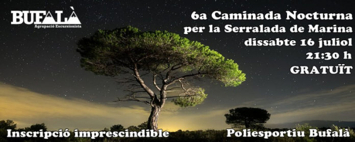 Aquest dissabte l’Agrupació Excursionista Bufalà torna a organitzar la Caminada Nocturna a través del Parc Natural de la Serralada de Marina. El recorregut circular és de 12 Km aproximadament amb desnivell +- 387 m. Per participar és necessària inscripció que és gratuïta. La sortida serà a les 21.30h. al carrer Campoamor davant del Poliesportiu del barri de Bufalà.