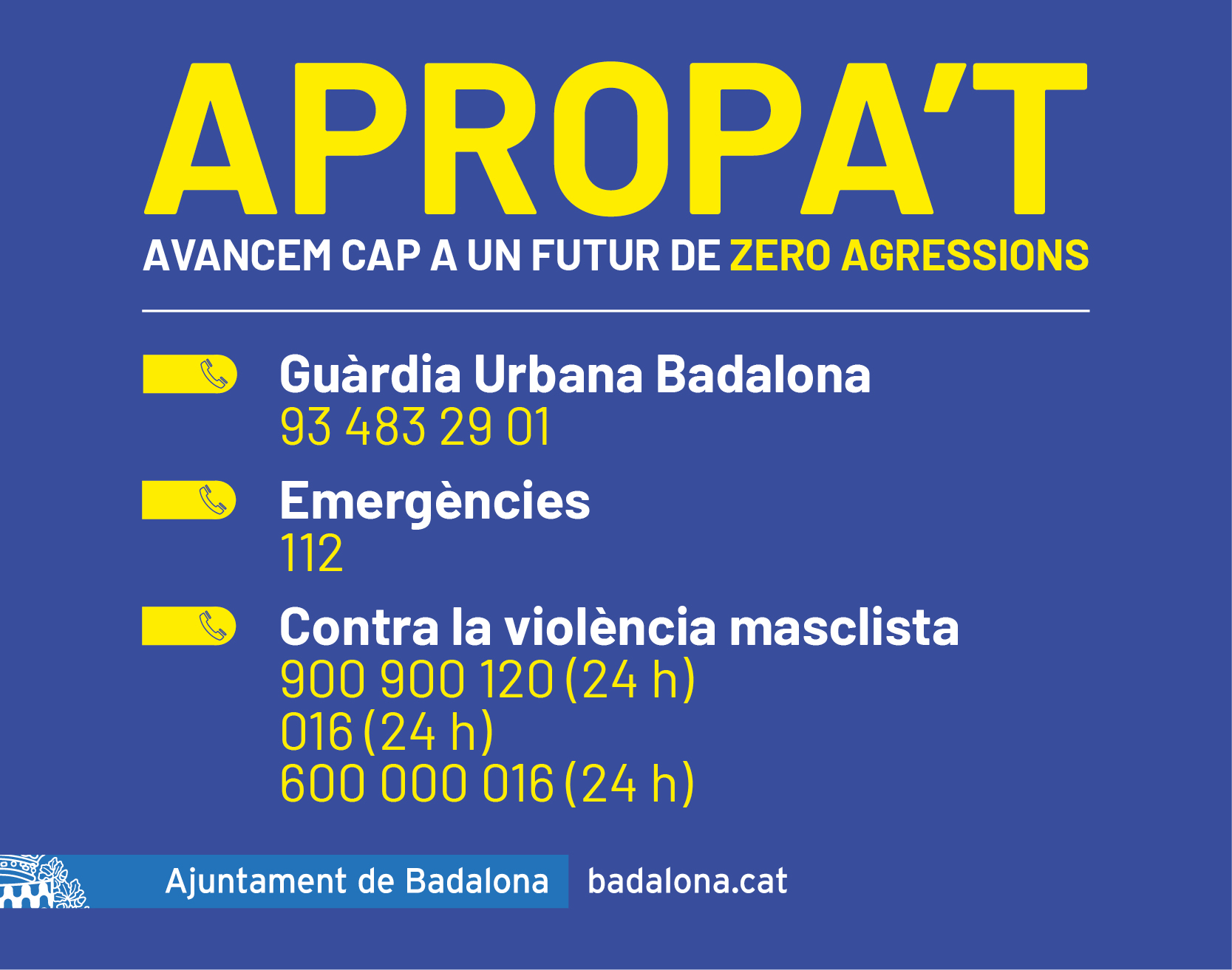 Badalona posa en marxa la primera campanya de prevenció de les violències sexuals que s’impulsa des de l’Ajuntament. Sota el lema “Apropa’t, avancem cap a un futur de zero agressions”, la iniciativa, que sorgeix d’una proposta de la Plataforma 25N, es basa en tres eixos d’actuació bàsics: donar resposta a qualsevol acte de violència sexual oferint suport, atenció i acompanyament a la víctima; instruir la ciutadania sobre com respondre davant una agressió, tant si és patida en primera persona com si la veus o n’ets coneixedor; i formar els possibles agressors per inhibir-los i fer que respectin els límits de les altres persones i coneguin les bases d’unes relacions lliures i igualitàries.