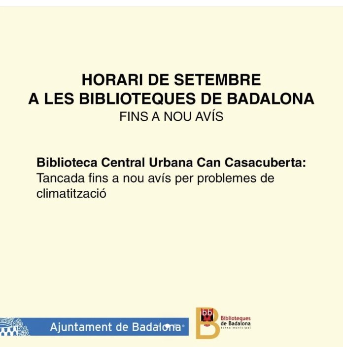 La Biblioteca Central Can Casacuberta torna a estar tancada. En ple d’agost, les altes temperatures van fer insuportable estar al seu interior. La famosa climatització de l’edifici,la principal raó que els treballadors i treballadores es van plantar fa tres anys i va tancar l’equipament. De fet la climatizació no ha funcionat correctament un cop oberta de nou, el passat mes de febrer. En ple agost l’Ajuntament la tancava i ara no hi ha data de reobertura, tot i que les temperatures s’ha normalitzat. De moment, l’Ajuntament ha anunciat que la biblioteca continuarà tancada. Recordem que durant el mes d’agost, el govern local, va anunciar que encarregarà durant el mes de setembre un projecte per renovar totalment la Biblioteca Central Urbana Can Casacuberta. El Govern municipal ha prioritzat aquesta decisió després que una nova incidència en la climatització obliguès a tancar temporalment la principal biblioteca del centre de la ciutat.