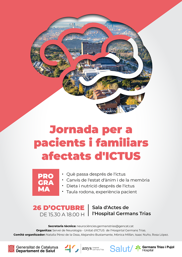 Què passa després de l’ictus? Quins canvis causa en l’estat d’ànim i en la memòria de les persones que el pateixen? Quina dieta i nutrició s’ha de seguir? Aquests i altres interrogants, dels que sovint no es parla prou, seran tractats aquest dijous 26 d’octubre (15:30h) a l’Hospital Germans Trias en una jornada emmarcada en la celebració, diumenge, del Dia Mundial de l’Ictus.