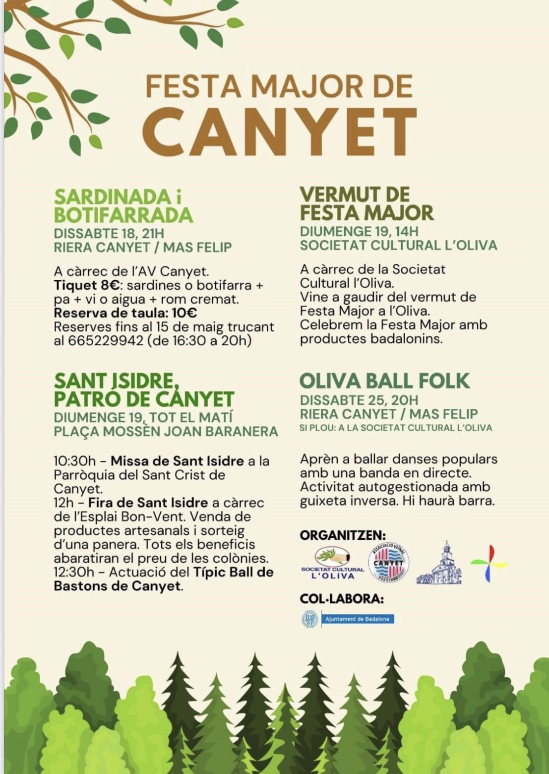 El barri de Canyet celebrarà, aquest cap de setmana, la seva Festa Major en honor a Sant Isidre. Dissabte hi haurà una botifarrada i una sardinda i “Oliva Ball Folk”. De cara a diumenge, una fira, missa i un vermut de Festa Major.