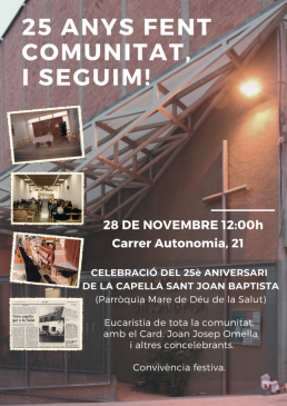 Amb motiu dels 25 anys de la Capella Sant Joan Baptista, comunitat cristiana jesuïta de la qual va sorgir la Fundació Salut Alta, aquest cap de setmana s’han preparat un parell de celebracions conjuntes. Per una banda, aquest divendres 26, de 17.30h a 19h, es reconeixerà la trajectòria de presència i acció social al barri sortint a jugar a la plaça Antonio Machado. Serà el primer “Divendres a la Plaça” des de l’inici de la pandèmia.