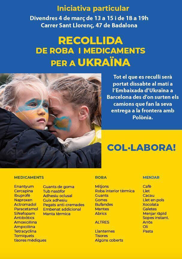 Campanya particular al Centre de Badalona. Recollida de roba i medicaments per a Ucraïna. Iniciativa popular, divendres 4 de març de 13h a 15 i de 18h a 19h al carrer Sant Llorenç, 47.