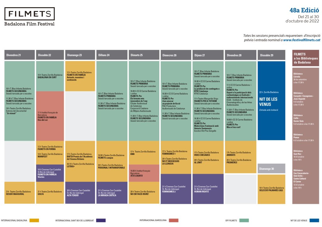En les edicions de 2020 i 2021 el festival va ser híbrid a causa de la pandèmia i una part de les pel·lícules es van haver de veure a través de la web del festival. Ara la normalitat ha tornat a tot arreu, i també als cinemes, així que en aquesta edició de 2022 els curtmetratges només es podran veure a les 3 seus oficials competitives de FILMETS. Les 218 pel·lícules en competició es podran veure al Teatre Zorrilla de Badalona, a l’Institut Français de Barcelona i als cinemes Can Castellet de Sant Boi de Llobregat.