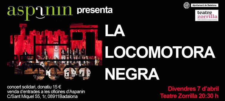 La Locomotora Negra és una orquestra de jazz d’arrel barcelonina amb esperit cosmopolita i llarga tradició. Els seus concerts són un potent màquina musical que no deixa indiferent cap assistent amb un ampli repertori de jazz negre en la seva vessant més popular. El divendres 7 d’abril La Locomotora Negra farà aquest concert solidari on s’acabarà de festejar els 50 anys d’Aspanin. La recaptació d’aquest concert servirà per ajudar a finançar la nova seu d’Aspanin el “Punt d’Assessorament Personalitzat”. La venda d’entrades del concert es realitza a les oficines de l’entitat (C/Sant Miquel, 55, 1r Badalona). Amb un donatiu de 15€ podreu gaudir de bona música i ajudar l’entitat.