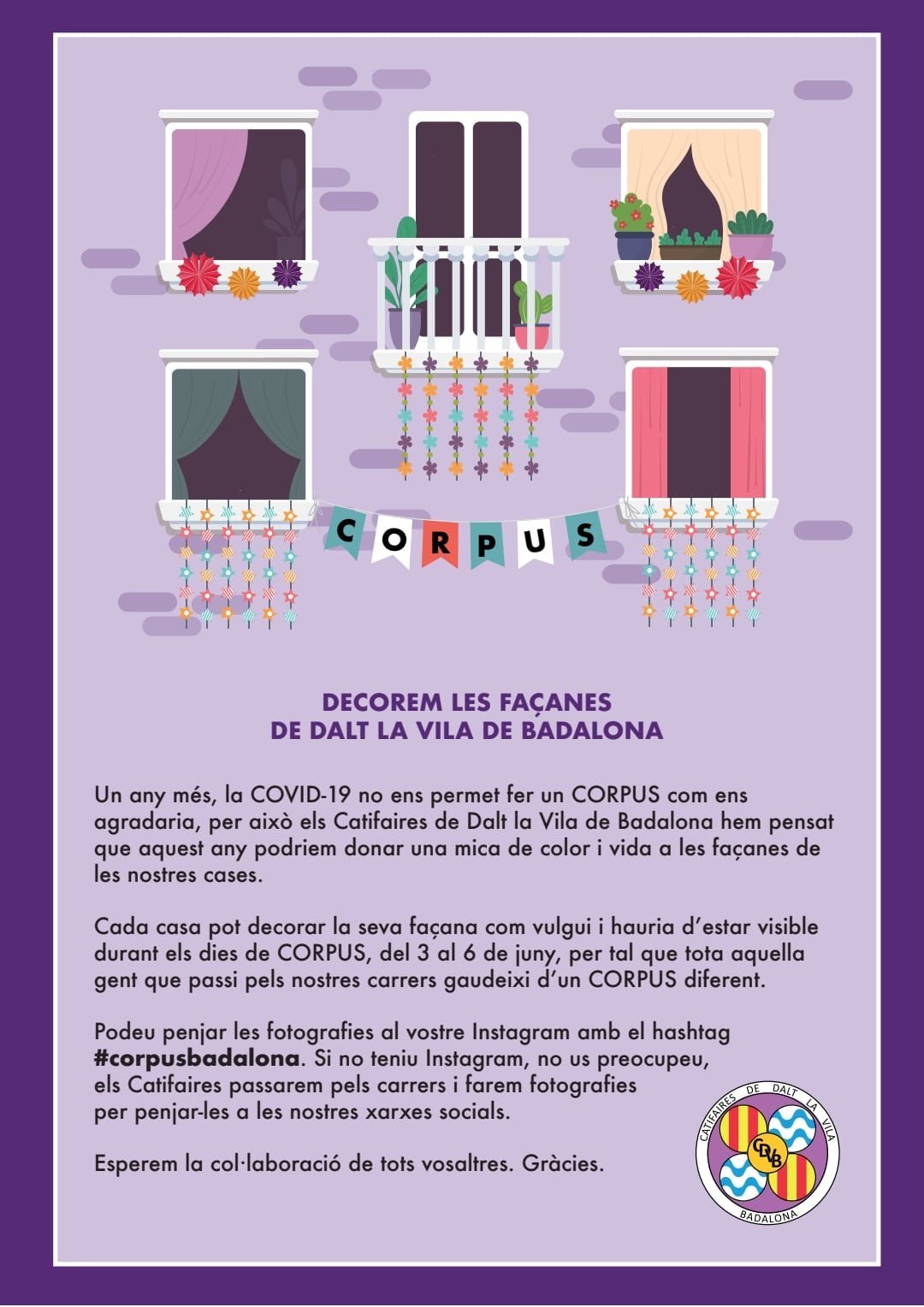 Com que enguany no serà possible fer les tradicionals catifes del corpus, l’associació de Corpus de Badalona proposa decorar les façanes del barri de Dalt la Vila. Del 3 a 6 de juny proposen guarnir balcons, finestres i portals amb flors, manualitats, banderoles o el que us vingui més de gust.