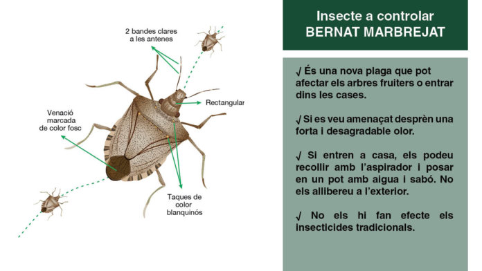 La regidoria de Salut ha alertat, a travès de les xarxes, que s’ha detectat la presència a Badalona del “Bernat Marbrejat”, una nova xinxa asiàtica invasora, que cal controlar. Aquest insecte danya els cultius, per això es demana ajuda ciutadana per eliminar-lo. Des de l’Ajuntament de Badalona demanen que si el trobem a casa no l’alliberem a l’exterior.