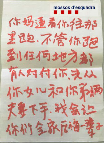 Els agents van tenir accés a una informació segons la qual un empresari xinès que regenta un basar al Polígon Badalona Sud estaria patint un procés extorsionador. En el decurs de la investigació els agents han constatat que el comerciant havia rebut diverses trucades i cinc cartes amenaçadores en les quals li exigien 60.000 euros. Els autors de l’extorsió en tot moment li deixaven clar que si no satisfeia la quantitat de diners exigida el matarien, a ell o a la seva família.  El procés extorsionador es va prolongar  durant un any. En aquest temps l’empresari va rebre fins a cinc cartes amenaçadores i trucades reiterades  per part de diferents interlocutors, directament o en gravacions de veu i amb la veu distorsionada en la majoria dels casos. En aquesta etapa extorsionadora els autors de les amenaces li van demostrar en tot moment que disposaven d’informació detallada, tant de l’activitat de la seva empresa com dels moviments de la seva família.  Alarmat per la situació va arribar inclús a tornar durant uns mesos a la Xina per mirar d’ocultar-se i evitar així l’amenaça. Durant el temps que va ser fora del país es va fer càrrec del negoci una treballadora seva que també va patir amenaces per part dels extorsionadors. En aquell moment a les trucades se li van afegir fins a cinc cartes que contenien amenaces de mort en mandarí amb tinta de color vermell per simular que estaven escrites amb sang per així donar un caràcter més intimidatori a les amenaces. Els agents van enviar les diverses cartes rebudes  a la Unitat Central d’Inspeccions Oculars, on es van revelar diferents fragments d’empremtes tot i que finalment no van proporcionar resultats positius per a la investigació.