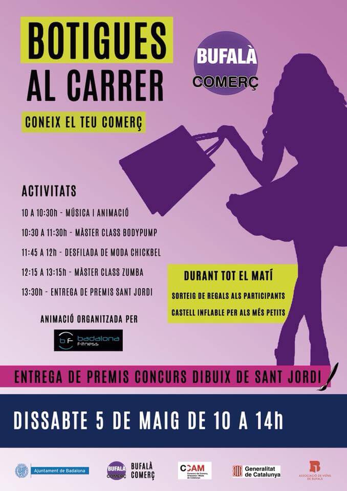 Aquest dissabte 5 de maig, de 10h a 13h, els comerços associats a Bufalà Comerç sortiran al carrer. Amb aquesta iniciativa, l’entitat comercial del barri vol incentivar el comerç a Bufalà. Les botigues obertes aniran acompanyades de descomptes i animació. A les 13:30h hi haurà l’entrega de premis de Sant Jordi, sorteig de regals i castell inflable per als més petits. A més, el barri de Bufalà celebrarà durant aquest mes de maig les seves festes de barri amb activitats a diferents punts centrades en fer relació amb els veïnat.