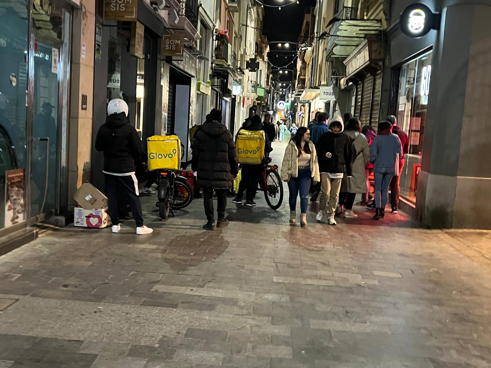 Aquesta és la imatge de la majoria de vespres al carrer de Mar de Badalona. Diversos ‘riders’ es concentren davant d’alguns establiments del carrer esperant les comandes per entregar i dificulten el pas als vianants.
