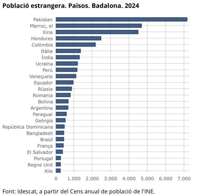 A Badalona, prop de 39.000 persones són residents estrangers, representant aproximadament el 17% de la població total de la ciutat. Aquesta diversitat cultural es reflecteix en la presència de comunitats provinents de diversos països, segons les dades de l’Idescat, de 2024.